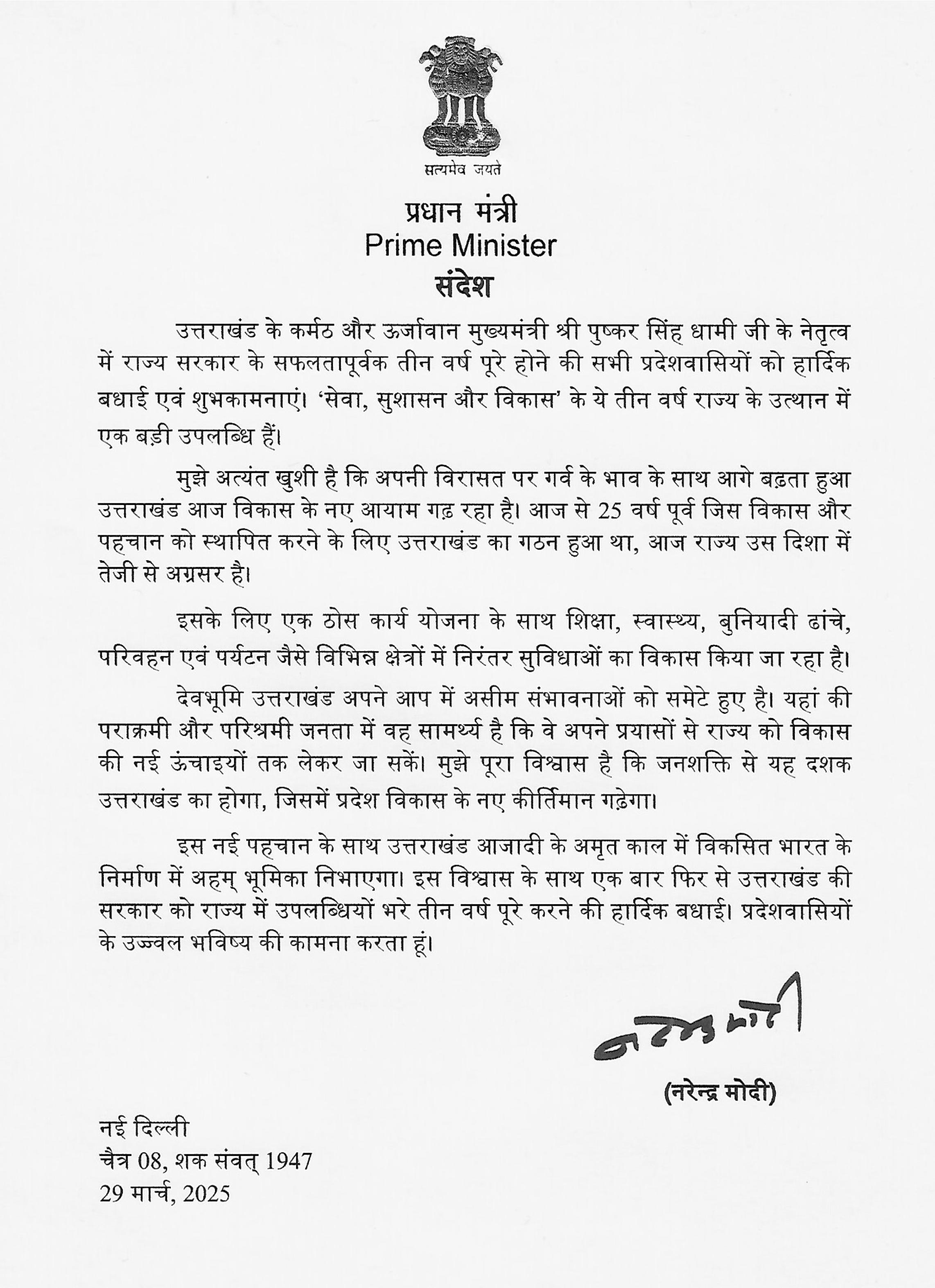 प्रधानमंत्री ने पत्र लिखकर मुख्यमंत्री पुष्कर सिंह धामी को कर्मठ और ऊर्जावान बताते हुए कहा ये तीन साल राज्य के उत्थान में बड़ी उपलब्धि
