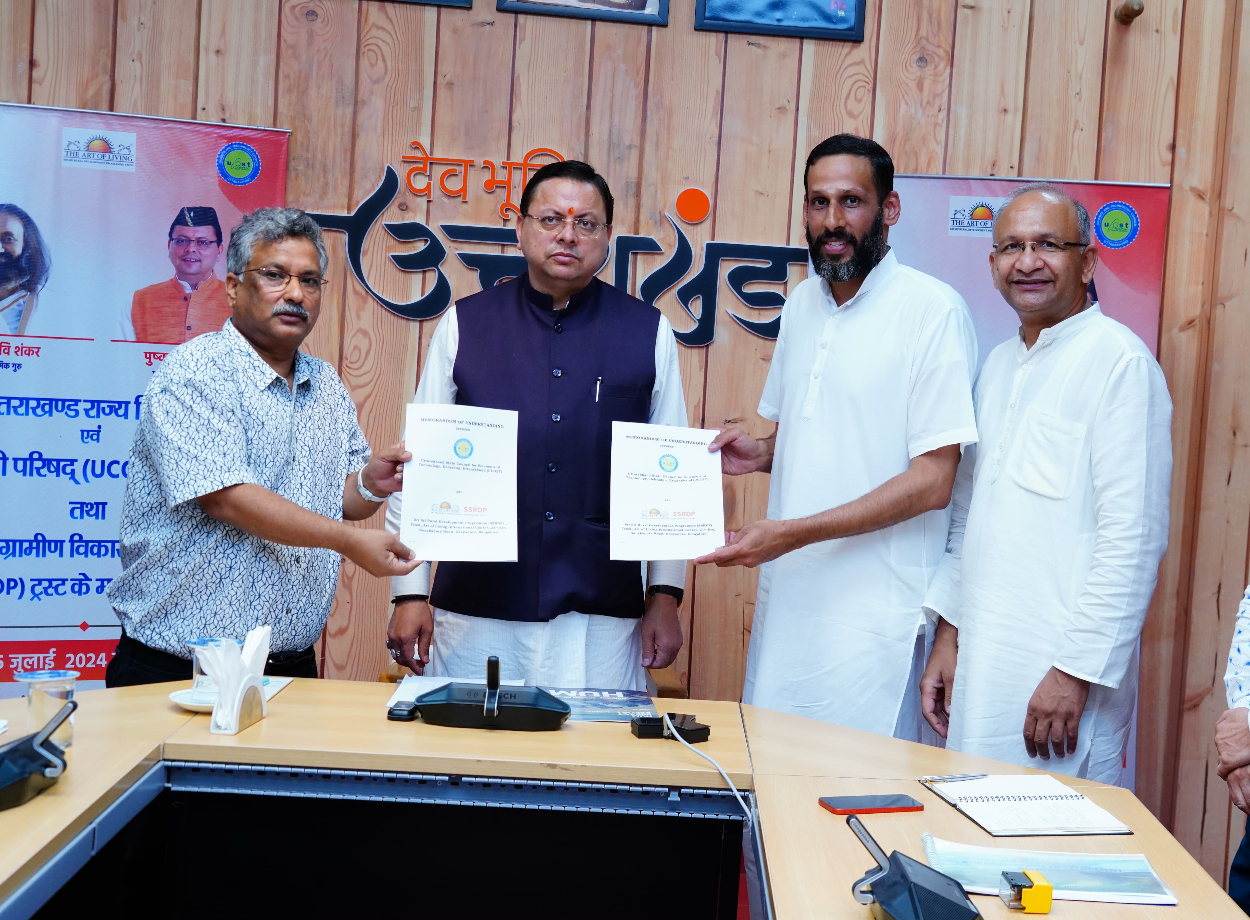 देहरादून- प्रदेश के ग्रामीण स्कूलों में 04 किलो वाट के सोलर पैनल एवं मॉर्डन क्लास रूमों का निर्माण श्री श्री ग्रामीण विकास परिजनों ट्रस्ट ( SSRDP) द्वारा किया जाएगा। इस संबंध में मुख्यमंत्री आवास में सीएम पुष्कर सिंह धामी की उपस्थिति में यूकॉस्ट के महानिदेशक प्रो. दुर्गेश पंत तथा ऑर्ट ऑफ लिविंग एवं SSRDP के प्रतिनिधि दीपक शर्मा के मध्य एमओयू हस्ताक्षरित किया गया।