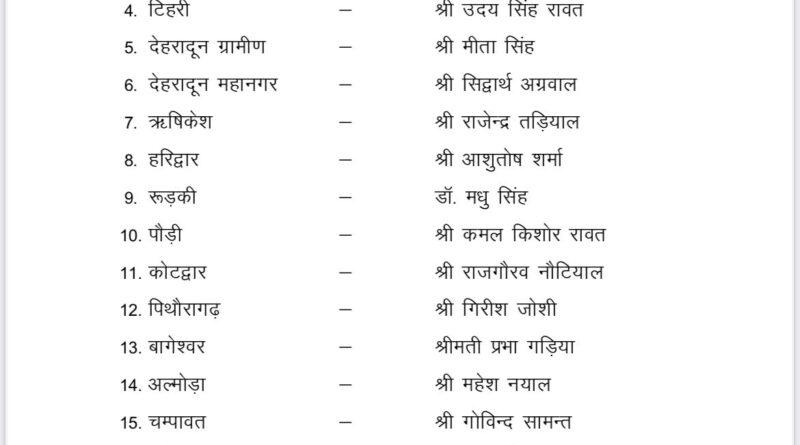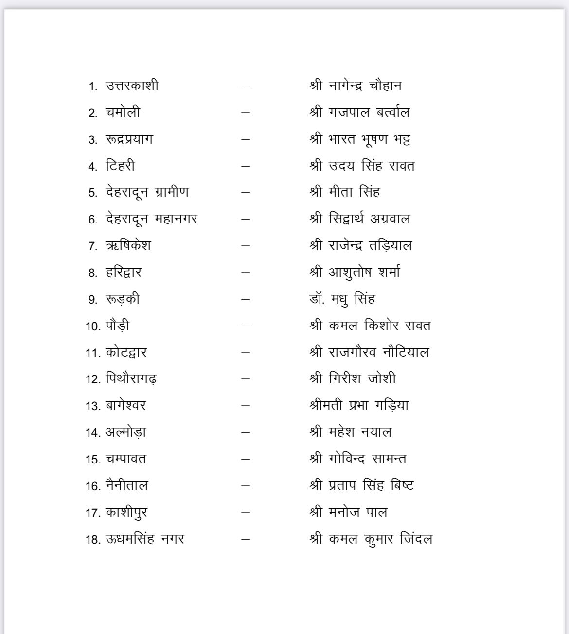 आज  जिलाध्यक्ष के रूप में जिनके नामों की घोषणा की गई है उसमें उत्तरकाशी के लिए नागेन्द्र सिंह चौहान, चमोली के लिए गजपाल बर्त्याल,  रुद्रप्रयाग भारत भूषण भट्ट, टिहरी उदय सिंह रावत, देहरादून ग्रामीण मीता सिंह, देहरादून महानगर सिद्धार्थ अग्रवाल, ऋषिकेश राजेन्द्र तडियाल, हरिद्वार आशुतोष शर्मा, पौड़ी कमल किशोर रावत, कोटद्वार राजगौरव नौटियाल, पिथौरागढ गिरीश जोशी, बागेश्वर प्रभा गड़िया, अल्मोडा महेश नयाल, चम्पावत गोविन्द सामन्त, नैनीताल प्रताप सिंह बिष्ट, काशीपुर मनोज पाल, रुड़की डॉक्टर मधु सिंह, ऊधमसिंह नगर  कमल कुमार जिंदल को जिम्मेदारी दी गई है।
