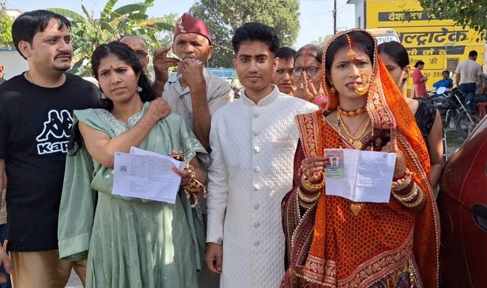 शादी के बाद दूल्हे के साथ वोट डालने पहुंची दुल्हन