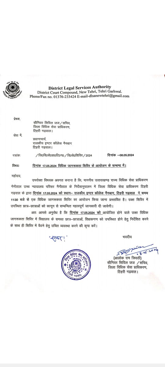 नैनबाग (राजीव डोभाल)- उत्तराखंड राज्य विधिक सेवा प्राधिकरण नैनीताल उच्च न्यायालय परिसर नैनीताल के निर्देशानुपालन में सीनियर सिविल जज सचिव विधिक सेवा प्राधिकरण टिहरी गढ़वाल के द्वारा तहसील नैनबाग के अंतर्गत सरदार सिंह रावत राजकीय इंटर कॉलेज नैनबाग में 17 मई समय 11:30 बजे से एक विधिक जागरूक शिविर का आयोजन किया जाना प्रस्तावित है उक्त शिविर में छात्र-छात्राओं को कानून से संबंधित महत्वपूर्ण जानकारियां दी जाएगी। तथा सभी छात्र छात्रों व शिक्षकगणों को उसे दिन उपस्थित रहने हेतु निर्देशित किया गया है।