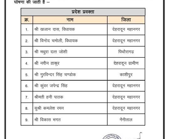 नए प्रवक्ता के रूप में विधायक विनोद चमोली, वरिष्ठ नेता मथुरा दत्त जोशी, गुरविंदर सिंह चंडोक और विकास भगत को मिली जिम्मेदारी,
