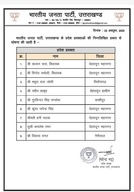 प्रदेश अध्यक्ष महेंद्र भट्ट के निर्देश पर 9 प्रवक्ताओं की सूची जारी की गयी,