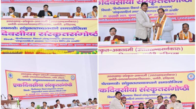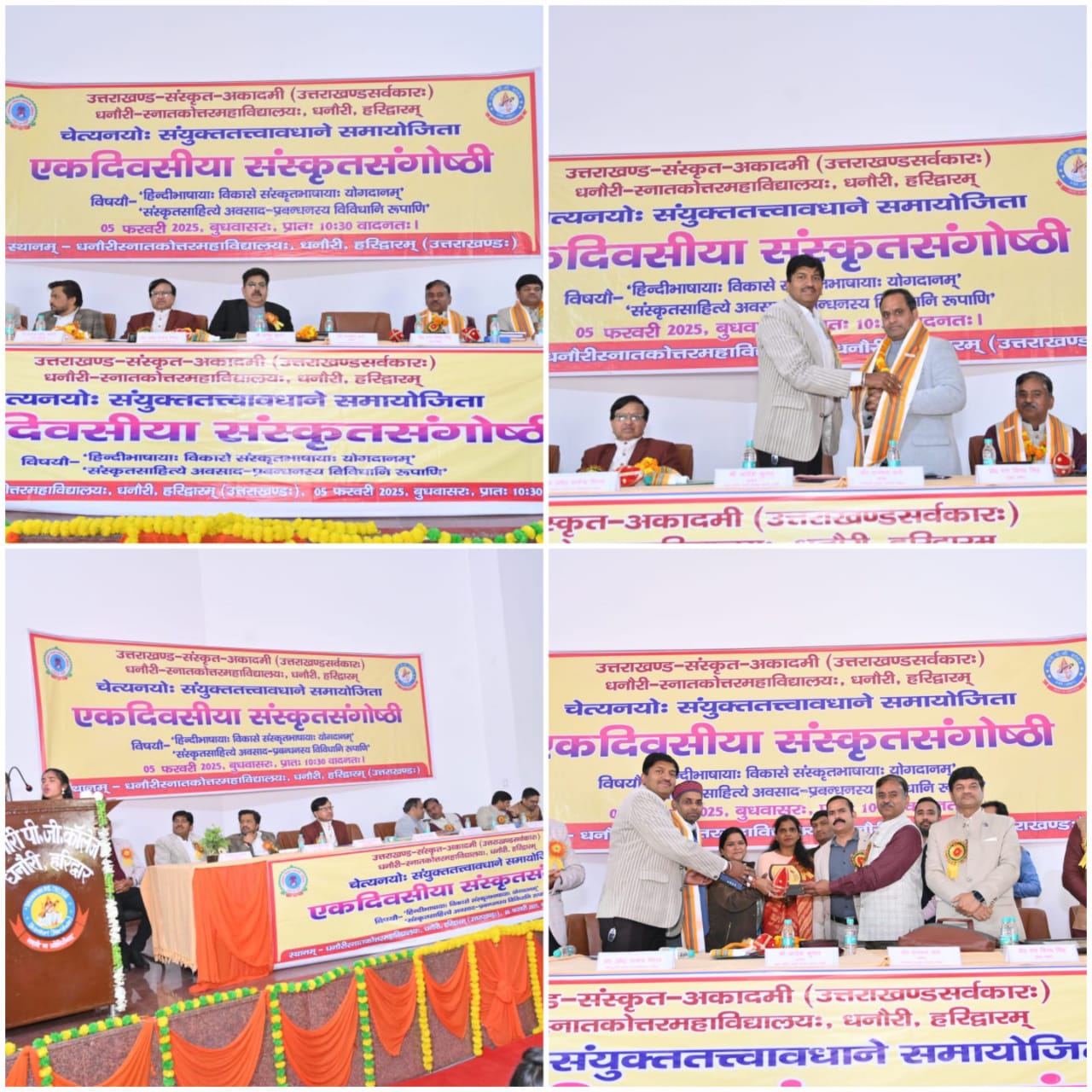 धनौरी(श्रवण गिरी)- हरिद्वार स्थित महाविद्यालय धनौरी पी. जी. कॉलेज, धनौरी में हिंदी विभाग द्वारा उत्तराखंड संस्कृत अकादमी हरिद्वार के तत्वाधान में “हिंदी भाषा के विकास में संस्कृत भाषा का योगदान एवं संस्कृत साहित्य में तनाव प्रबंधन के विविध रूप” विषय पर एक दिवसीय राष्ट्रीय संगोष्ठी का आयोजन किया गया। इस अवसर पर विभिन्न विश्वविद्यालयों एवं शिक्षण संस्थानों के प्रख्यात विद्वानों, शोधकर्ताओं, शिक्षकों एवं छात्रों ने सहभागिता की। संगोष्ठी का उद्देश्य हिंदी भाषा के ऐतिहासिक, सांस्कृतिक और समकालीन महत्व पर गहन विमर्श करना था।