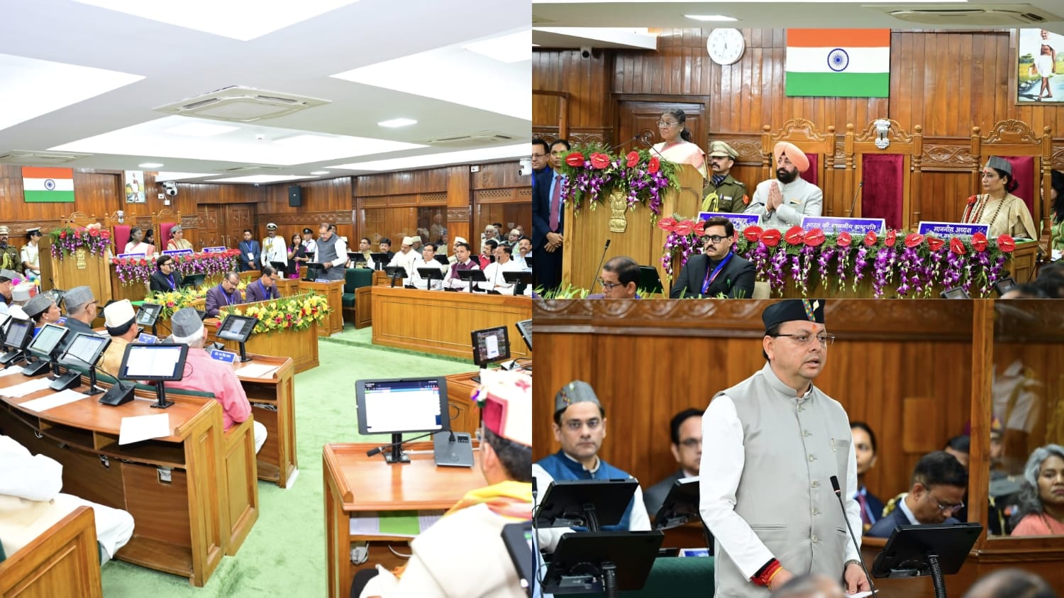 मुख्यमंत्री पुष्कर सिंह धामी ने अपने स्वागत भाषण में कहा कि उत्तराखंड राज्य स्थापना के रजतोत्सव पर आयोजित इस विशेष सत्र में राष्ट्रपति का मार्गदर्शन हम सबको प्राप्त हो रहा है। इसके लिए उन्होंने राष्ट्रपति का आभार व्यक्त किया। उन्होंने कहा कि राष्ट्रपति का सम्पूर्ण जीवन संघर्ष, समर्पण और राष्ट्रसेवा का अनुपम उदाहरण है। उनके व्यक्तित्व में मातृत्व की ममता, सेवा का संकल्प और राष्ट्र के प्रति अटूट समर्पण का अद्भुत संगम निहित है। उन्होंने सदैव अंतिम पायदान पर खड़े व्यक्ति के कल्याण को प्राथमिकता देते हुए समाज के वंचित, शोषित एवं पिछड़े वर्गों के सशक्तिकरण हेतु कार्य किया है।