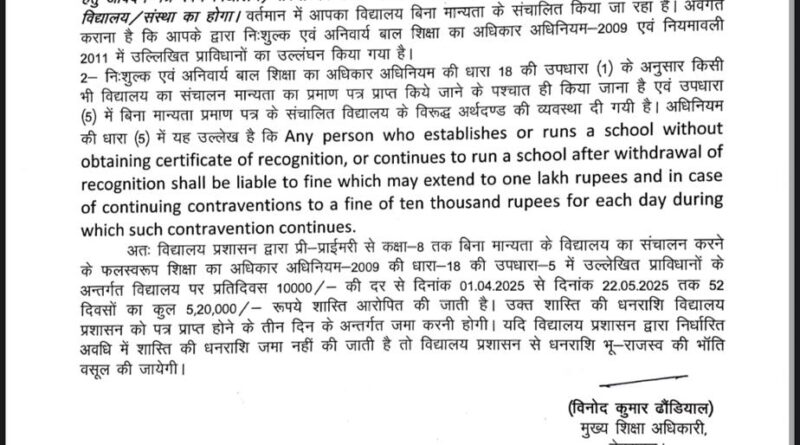 जिले के भानियावाला में अवस्थित प्रसिडंेसी इन्टरनेशनल स्कूल का फीस बढोतरी पर 100 से अधिक अभिभावकों द्वारा डीएम को शिकायत की गई थी। डीएम के निर्देश पर सीडीओ पर बुलाये जाने के उपरान्त भी स्कूल प्रबन्धन उपस्थित नही हो रहे थे। अभिलेखों की जांच करने पर पाया गया कि विद्यालय को प्री प्राईमरी से कक्षा 8 तक अंग्रेजी माध्यम से मार्च 2020 से मार्च 2025 तक की अवधि 5 वर्ष के लिए मान्यता प्रदान की गई थी, जबकि स्कूल प्रबन्धन द्वारा मान्यता नवीनीकरण के लिए अभी तक आवेदन नही किया गया है, जिस पर जिला प्रशासन द्वारा द प्रसिडेंसी विद्यालय पर प्री-प्राईमरी से कक्षा-8 तक बिना मान्यता के विद्यालय का संचालन करने के फलस्वरूप शिक्षा का अधिकार अधिनियम-2009 की धारा-18 की उपधारा-5 में उल्लेखित प्राविधानों के अन्तर्गत विद्यालय पर प्रतिदिवस 10,000/- की दर से दिनांक 1 अपै्रल 2025 से 22 मई 2025 तक 52 दिवसों का कुल 5,20,000/- रूपये शास्ति आरोपित कर दी गई है। उक्त शास्ति की धनराशि विद्यालय प्रशासन को पत्र प्राप्त होने के तीन दिन के अन्तर्गत जमा करने के निर्देश दिए हैं। यदि विद्यालय प्रशासन द्वारा निर्धारित अवधि में शास्ति की धनराशि जमा नहीं की जाती है तो विद्यालय प्रशासन से धनराशि भू-राजस्व की भाँति वसूल की जायेगी।