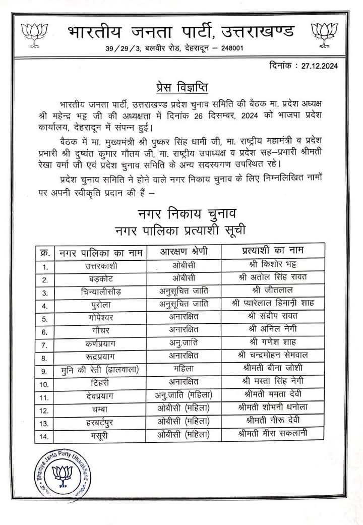 भाजपा ने निकाय चुनाव के लिए प्रत्याशियों की पहली सूची करी जारी,