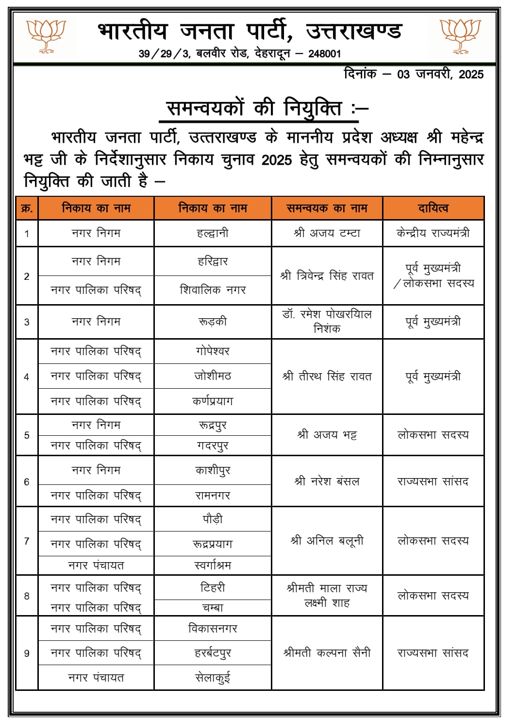 देहरादून- भाजपा ने प्रदेश मे सभी नगर निगम, नगर पालिका तथा नगर पंचायतों मे चुनाव संचालन के लिए समन्वयक नियुक्त किये है।