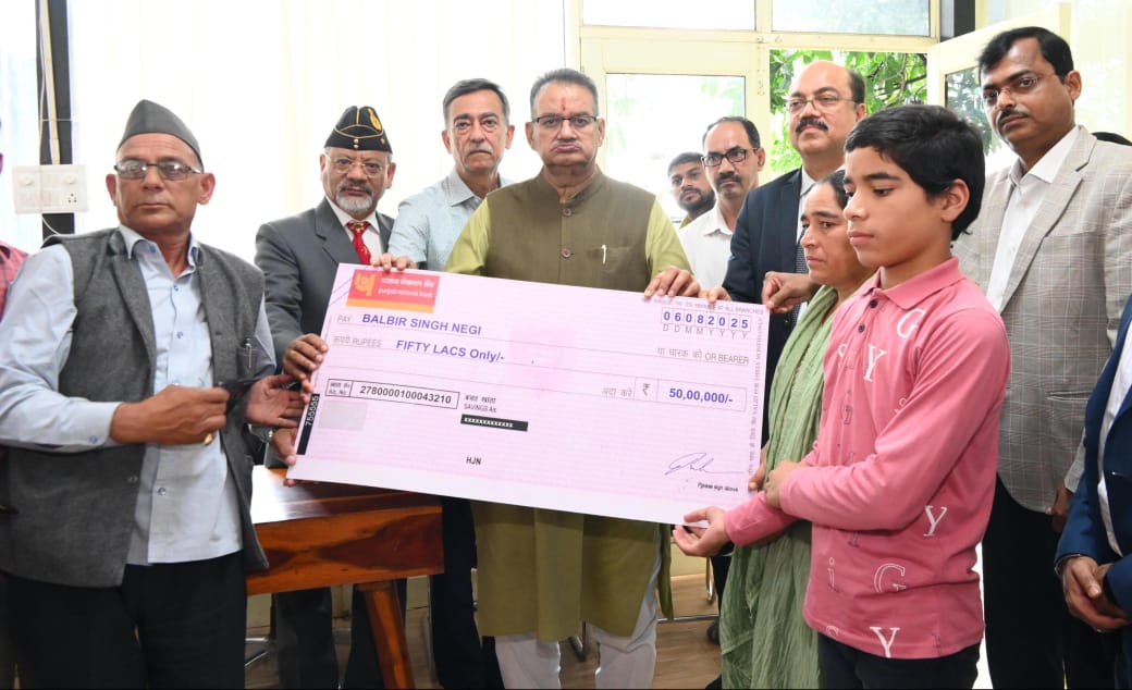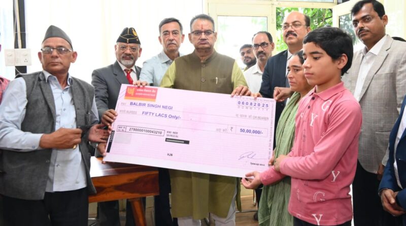 सैनिक कल्याण मंत्री गणेश जोशी ने मृतक उपनलकार्मिक के पिता बलवीर सिंह नेगी को 50 लाख की सहायता का सौंपा चैक
