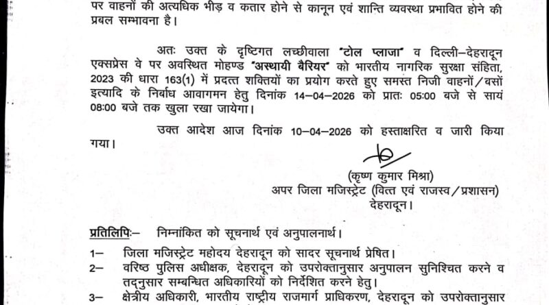देहरादून शहर को जाम से मुक्त रखने को डीएम के आदेश, 14 अप्रैल को लच्छीवाला टोल प्लाजा, आशा रोडी बैरियर रहेगा टोल मुक्त