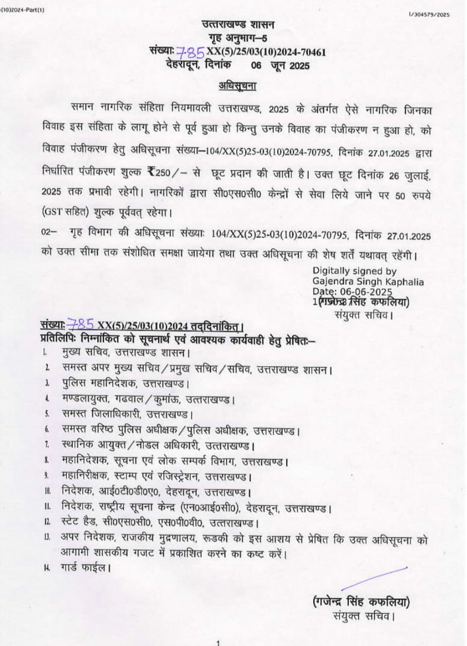 उत्तराखंड में समान नागरिक संहिता (Uniform Civil Code – UCC) दिनांक 27 जनवरी 2025 से प्रभाव में आ चुकी है। इसके अंतर्गत, 26 मार्च 2010 से लेकर 26 जनवरी 2025 के बीच संपन्न सभी विवाहों को UCC के अंतर्गत पंजीकृत कराना अनिवार्य किया गया है। वर्तमान में, इस अवधि के भीतर हुए विवाहों के पंजीकरण हेतु ₹250 का शुल्क निर्धारित है। हालांकि, राज्य सरकार ने नागरिकों की सुविधा एवं सहभागिता को ध्यान में रखते हुए यह निर्णय लिया है कि यदि 27 जनवरी 2025 से पूर्व हुई शादियों का पंजीकरण आगामी 26 जुलाई 2025 तक कराया जाता है, तो इसके लिए किसी प्रकार का पंजीकरण शुल्क देय नहीं होगा।