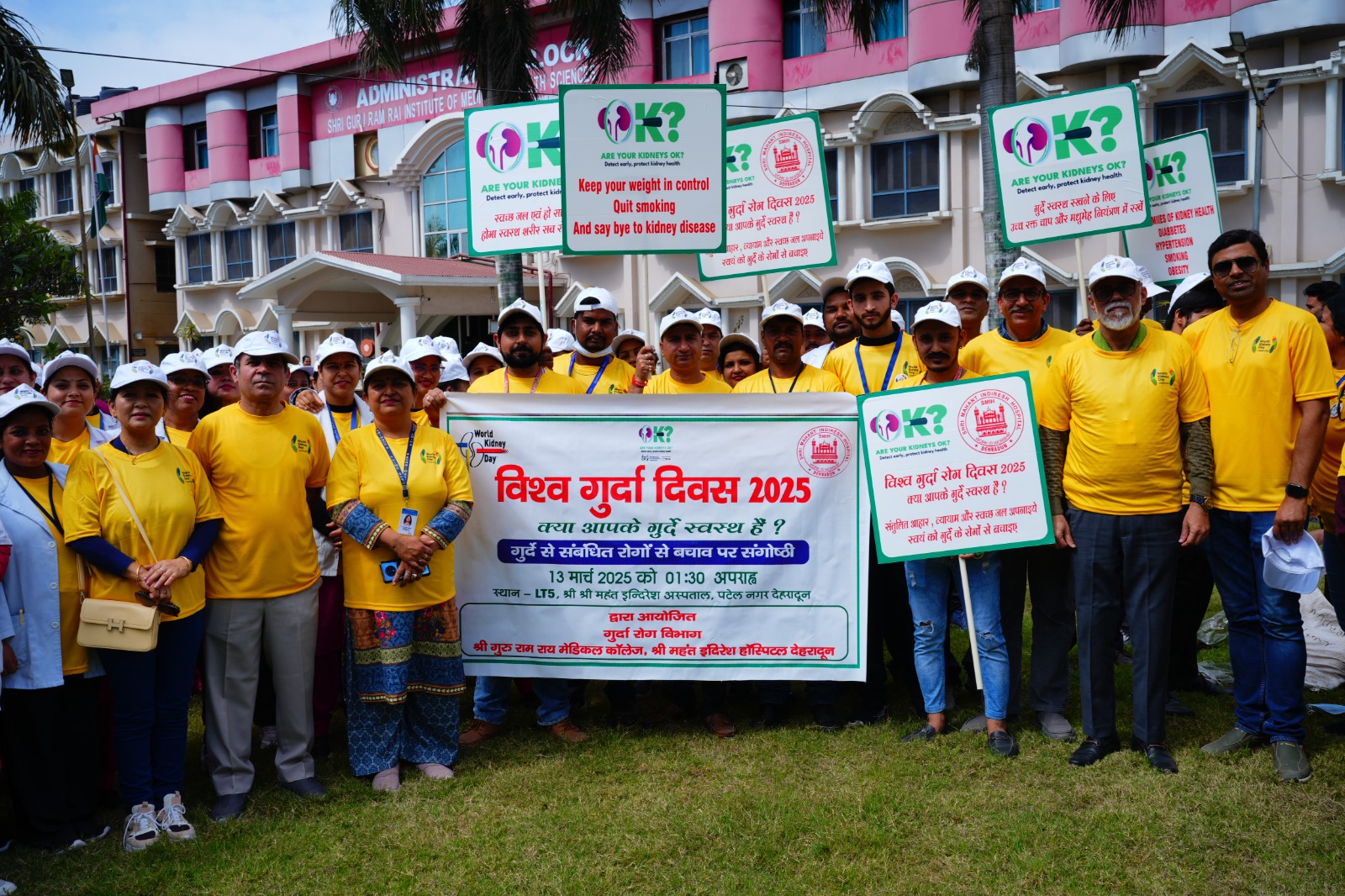 गुरुवार को श्री गुरु राम राय इंस्टीट्यूट ऑफ मेडिकल एण्ड हेल्थ साइंसेज परिसर से रैली का शुभारंभ हुआ। एसजीआरआर मेडिकल काॅलेज के प्राचार्य डाॅ अशोक नायक एवम् श्री महंत इन्दिरेश अस्पताल के चिकित्सा अधीक्षक डाॅ अजय पंडिता ने रैली को हरी झण्डी दिखाकर रवाना किया। क्या आपकी किडनी स्वस्थ है थीम पर डाॅक्टरों ने किडनी बचाने का संदेश दिया। डाॅक्टरों एवम् मेडिकल छात्र-छात्राओं ने हाथों में किडनी बचाव के स्लागन व नारों से किडनी स्वास्थ्य सम्बन्धित जागरुकता की अलख जगाई। रैली में उन्होंने संतुलित आहार, व्यायाम व स्वच्छ जल अपनाईए स्वयं को गुर्दा रोगों से बचाईए। वनज को नियंत्रित रखें व धूम्रपान छोड़े गुर्दा रोगों को कहें बाय बाय। ब्लड प्रेशर एवम शुगर को नियंत्रित रखें, गुर्दाें को बीमारी से बचाएं जैसे संदेशों से आमजन को जागरूक किया।